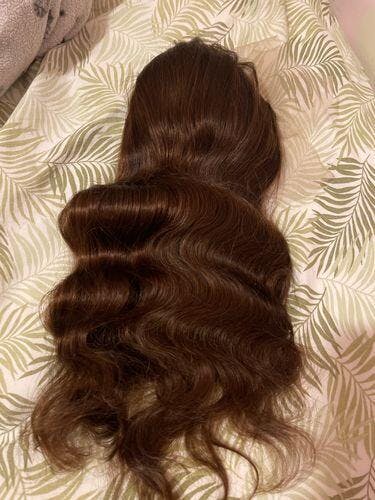 Pour les amoureux des cheveux châtains, nous vous proposons cette perruque ondulée aux nuances châtaines éclaircies et aux racines noires avec un aspect cheveux soyeux et brillants.