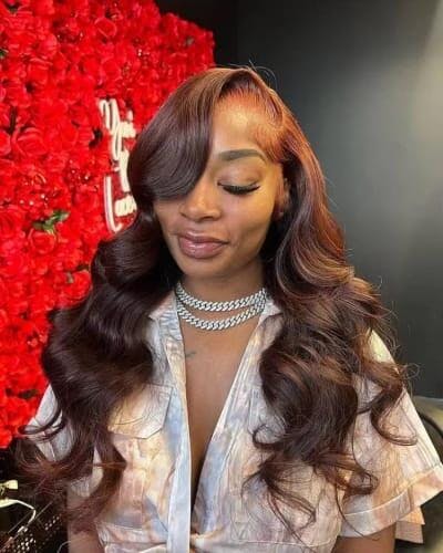 Vous pouvez également opter pour la perruque châtaine ondulée avec des racines noires si vous désirez allier charme, élégance et glamour.